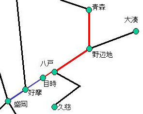 가능 구간. 파란선은 'IGR 이와테 은하 철도', 검은선이 JR재래선임.]