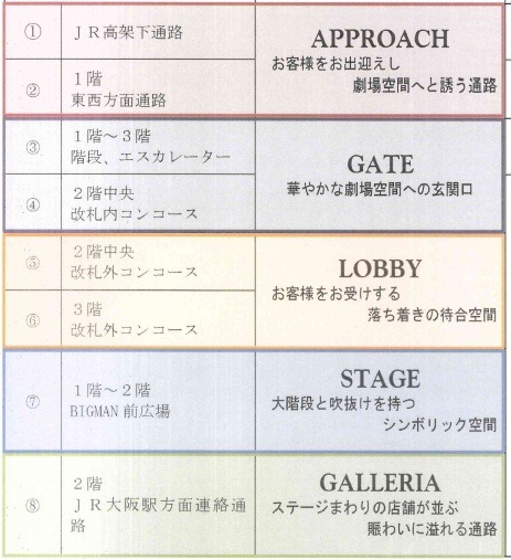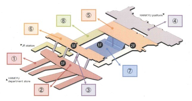 이 공사에 있어서의 공간 컨셉은 "극장 공간(劇場空間) 한큐스타일"이다. 전체를 8개의 zone으로 구분하게 된다.