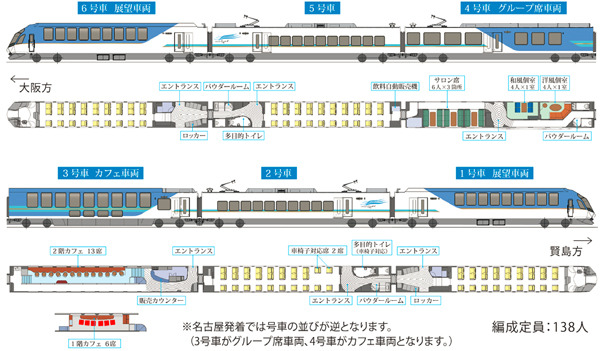 카페 차량은 긴테츠 전통의 2층 건물 구조이며, 차내의 좌석은 모두 3열배치이고, 시트 간격도 125cm로 기존의 특급