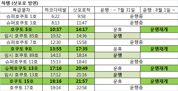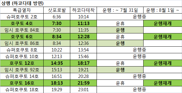 *하코다테-삿포로 특급열차 시각표 (호쿠토, 슈퍼호쿠토)