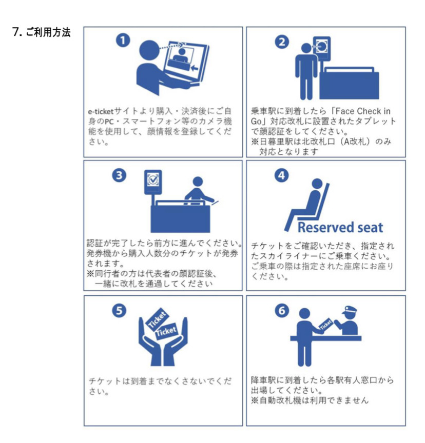 사전에 얼굴정보를 등록하고, 승차역 개찰구를 통과시에 설치된 태블릿에 얼굴을 비추는 것만으로도 가장 가까운 시간에 발차하는 스카이라이너 지정석권 티켓이 발권됩니다.