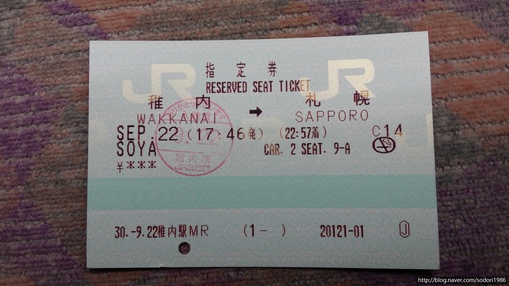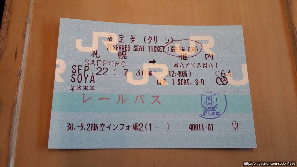특급 소야, 삿포로역(07:30)→왓카나이역(12:40) 1호차(그린샤) 좌석은 8D번 입니다.