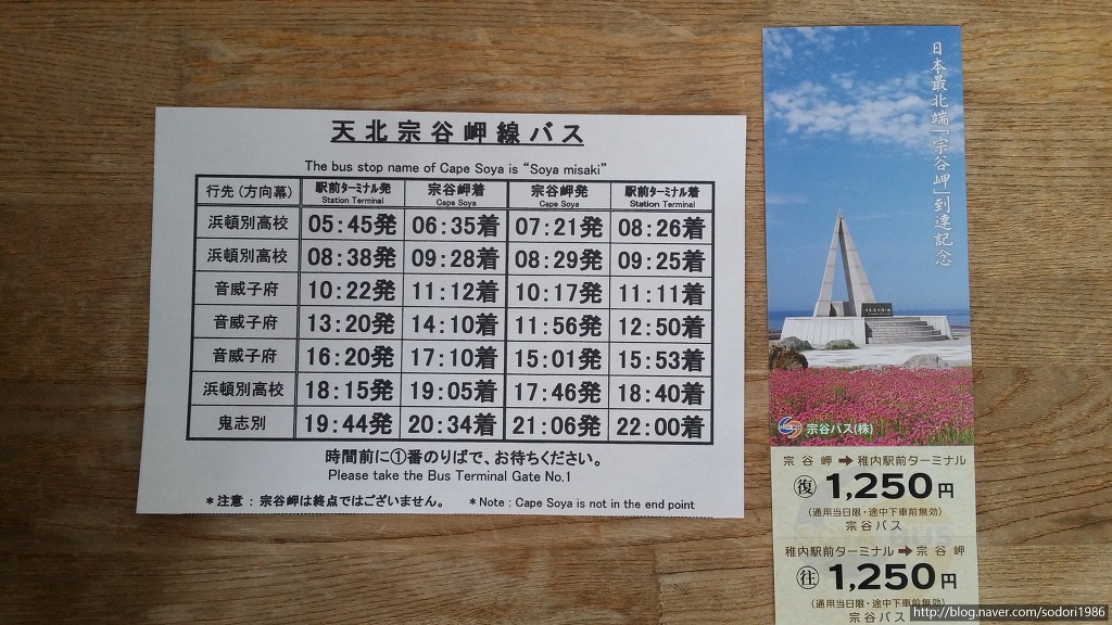 왓카나이역↔소야미사키 왕복으로 갈 수 있는 버스 승차권입니다. 그리고 왕복구간 버스 시간표도 같이 받았습니다.