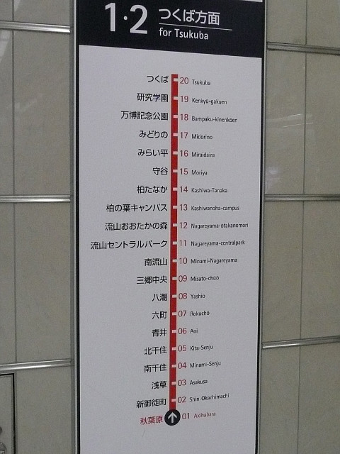 [ 사진 116. 츠쿠바 익스프레스는 총 20개역으로 되어 있습니다. 반대쪽 종점은 츠쿠바. 목적지인 미나미센쥬까지는 4정거장입니다.]