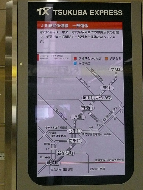 [ 사진 115. 츠쿠바 익스프레스의 노선과 연게 노선을 일목요연하게 표시해주고 있습니다. 각 노선들의 운행현황도 실시간으로 알려주죠. JR 소부쾌속선의 일부열차가 운휴된다는 소식을 알려주고 있습니다.]