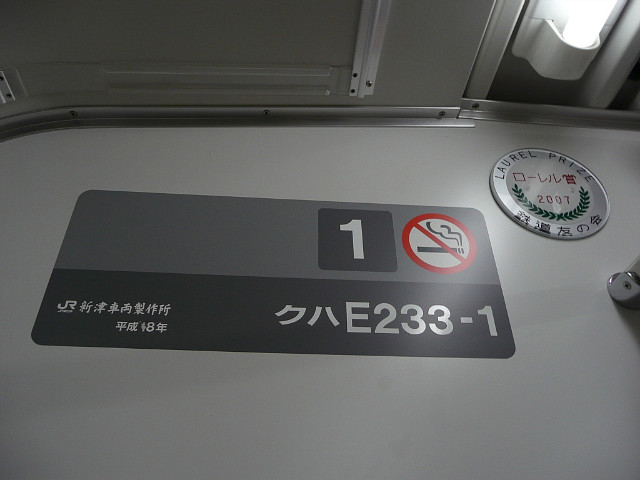 [ 사진 103. E233계의 첫번째 편성을 탔습니다. 심지어 1호차에~^^. JR동일본 니이츠 차량제작소에서 2006년에 제조, 2007년에 로렐상을 수상한 '작품'입니다.]