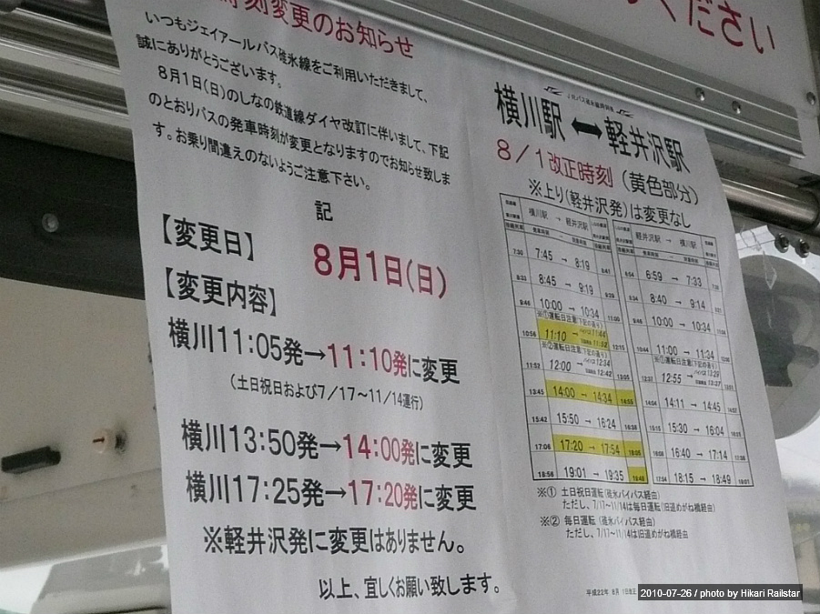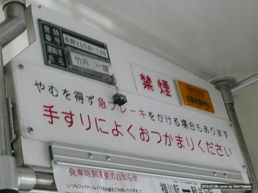 [사진 456. 운전석 바로 뒤에 큼직한 안내문이 붙어 있는데요 8월 1일에 3편에 대해 요코카와역 출발시간이 변경된다는 안내입니다. 카루이자와역 출발편은 변동사항이 없다네요. 드물게 운행하는 노선에서 이런 내용의 안내는 중요합니다.]