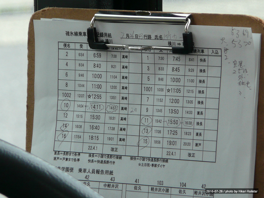 [사진 459. 이 날 다케우치 운전사의 운전시각표입니다. 제가 탄 버스는 15시 50분 발의 11편이 되겠습니다. 우측 상단에 적혀있는 내용들은 저희와 관련되는 내용인데요 JR패스의 일련번호와 내용을 기록해 놓은 것입니다. 그렇다면 눈치채셨겠죠? 요코카와~카루이자와 간의 JR버스는 JR패스로 이용이 가능한 노선입니다.]