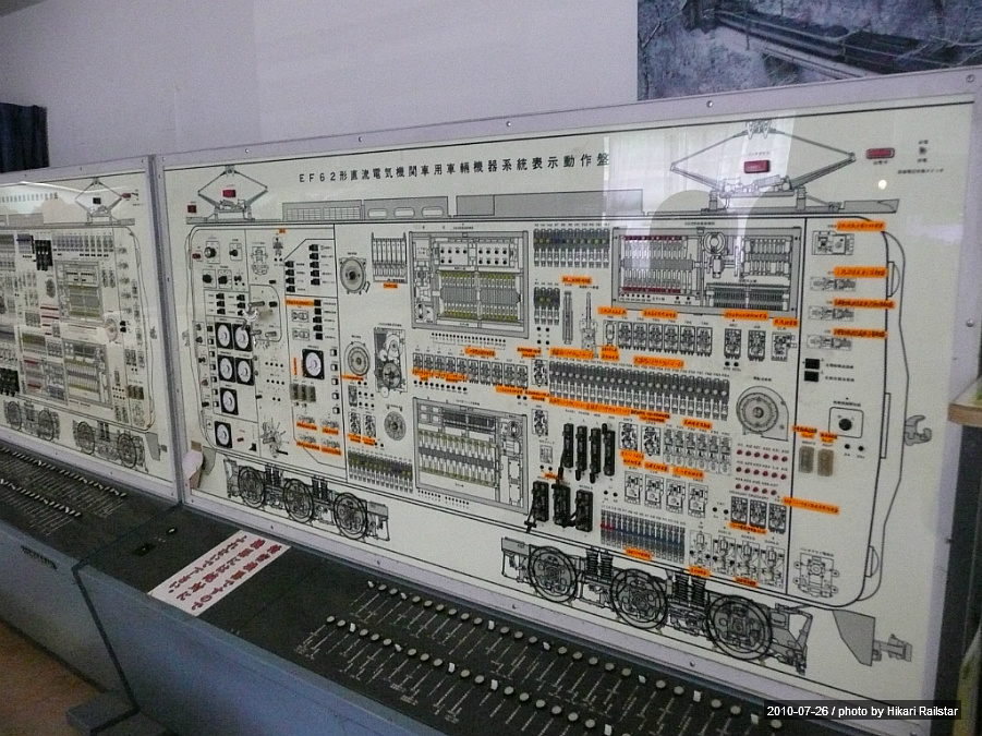 [사진 434. EF62형 전기기관차의 구조를 설명해주는 내용도 있지요. EF62형 역시 우스이고개 구간돌파를 위해 제작된 형식으로 1962년 시작차가 개발된 이래 1963~69년에 걸쳐 총 54량(시작차포함)이 제작되었습니다. EF63과의 가장 큰 차이점은 대차인데요 EF63이 2축대차 3개로 구성된 반면 EF62는 3축대차 2개로 구성이 되었었습니다. 현재 우스이철도 문화촌에 1호기와 54호기가, 그리고 나가노종합차량센터에 3호기가 보존되어 있습니다.]