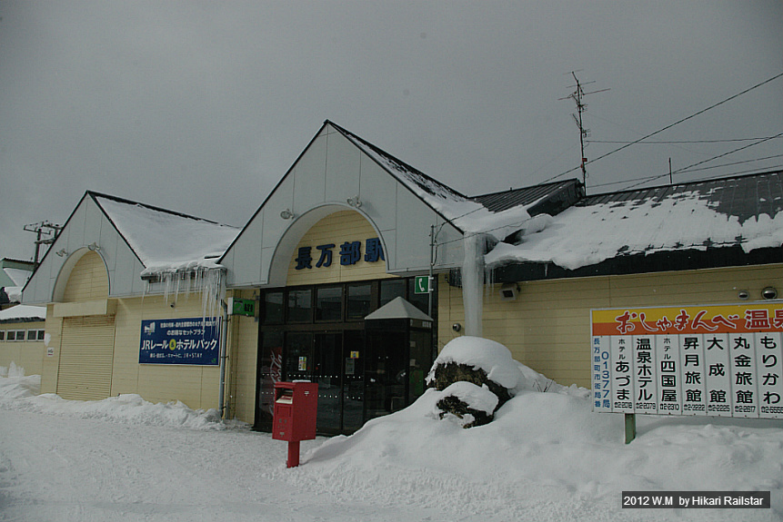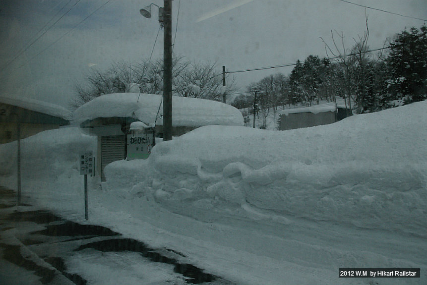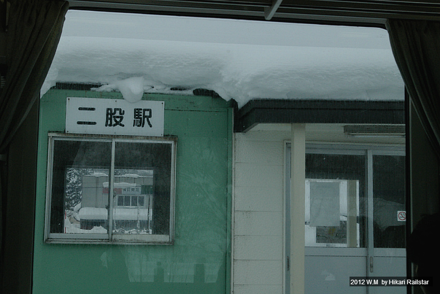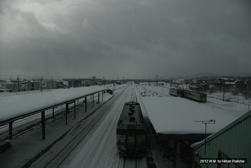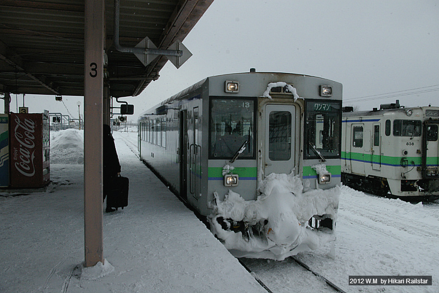 [사진 1211. 키하 150계 단칸방이 출발을 기다리고 있습니다. 눈이 엉겨붙어서 연결기쪽은 완전히 파묻혔습니다.]