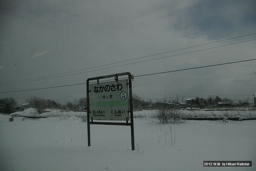 [사진 1192. 다음 역인 나카노사와역의 역명판은 그냥 벌판 위에 서 있는 것처럼 보입니다.]