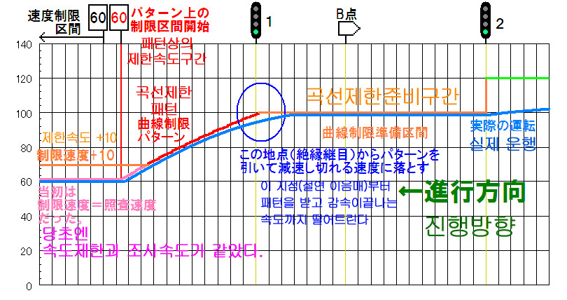 1. '억속 (105km/h 제한)' , '감속 (75km/h 제한)'신호를 넘기면 필요이상으로 감속 (45km/h 까지 감속) ,