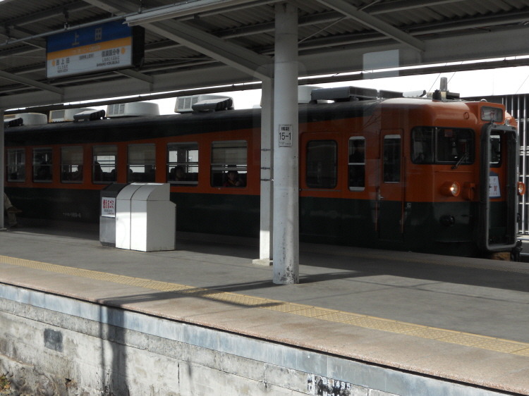 반대편에는 시나노철도에서 한 편성밖에 없는 169계 쇼난도색 차량입니다. 실제로 저 챠랑을 촬영하러 오는 철도팬들이 많으며, 시나노철도 홈페이지에서는 매일매일 쇼난도색 차량 운영시간표를 공개하고 있습니다.