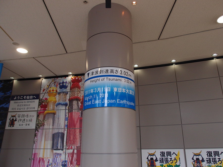 공항 1층에는 당시 쓰나미가 올라온 높이를 표시해 주고 있는데요. 높이가 3.02미터.. 게센누마나 이시노마키보다야 낮습니다만