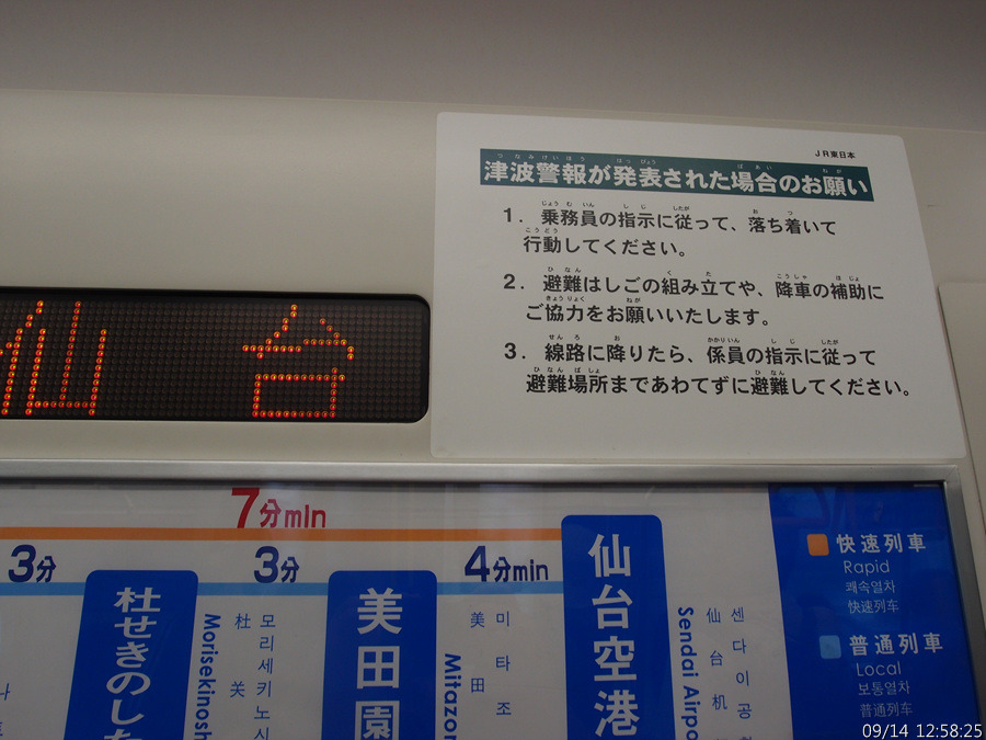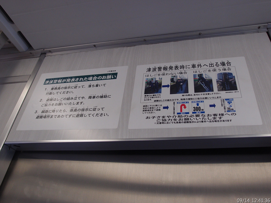 [사진 023] 차내에는 쓰나미 경보가 발령되었을 때의 피난 방법을 붙여놓았는데요.