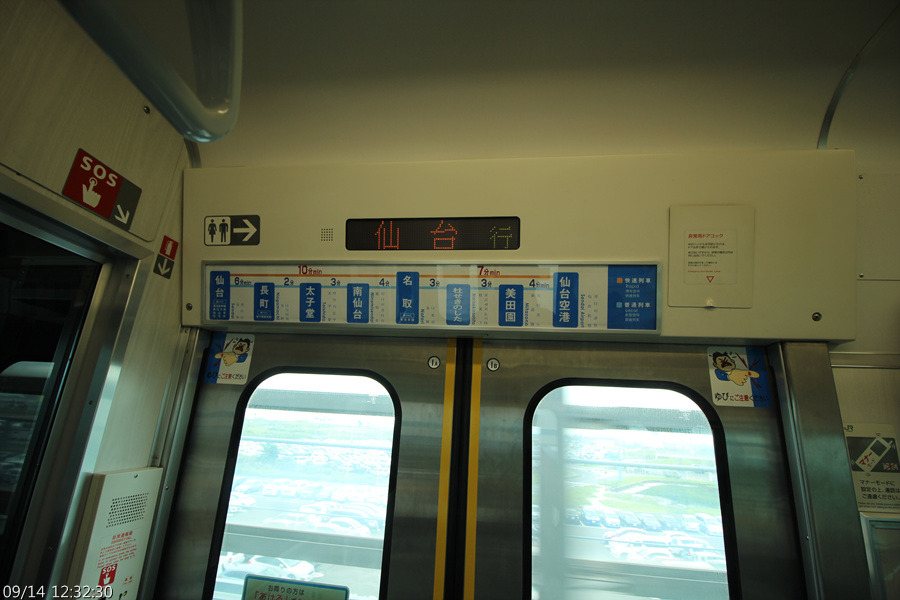 센다이 공항에 도착하여, 센다이 공항철도를 타고 센다이 시내로 가고 있습니다.