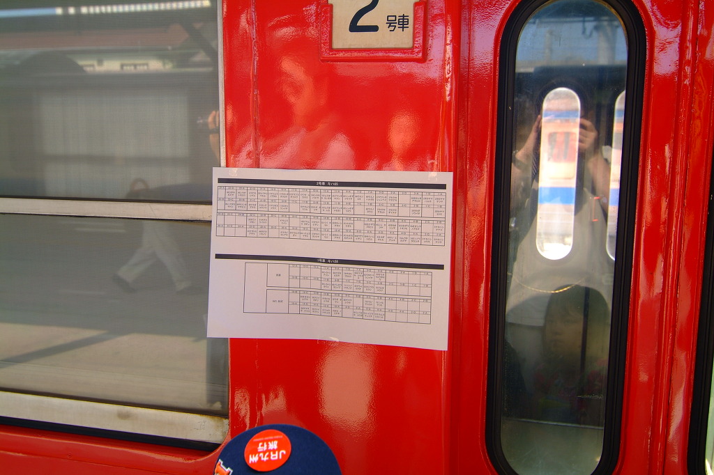 <사진 54> 그래도 어쨌든 JR이고 급행이니 JR패스로 탑승할 수 있지 않을까 했더니, 아예 좌석별로 예약자명을 인쇄하여 붙여놨더군요. 아마도 일반 승차권으로 판매한 열차가 아니고 관광상품의 일환 같습니다. 인터넷에 찾아보니, 이 날짜는 안 나오고 2010.5.30일에 관광상품으로 운행한 기록이 있더군요. 그때는 모지코 역에는 안 왔었는데, 구마모토~히코산~오이타 구간이 오리지날 벤또, 촬영회 이벤트 등 다 해서 12,000엔이었더군요.