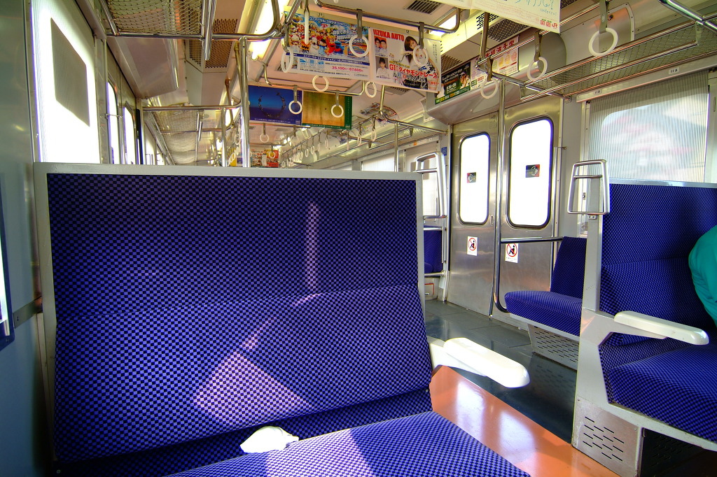 <사진 46> 열차에 탑승했습니다. 아까 시모노세키에서 모지까지 타고 온 415계와 같은 415계인 것 같은데, 아까는 롱시트였는데 이번 차는 크로스시트입니다.멀리 닛포본선의 우사 역에서 시발한 열차입니다. 손님은 이 칸에 저 혼자였던것 같습니다. 누가 파스를 떼어서 그냥 좌석에 버리고 갔군요.