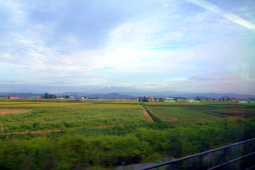 <사진 922> 농장들이 보이고, 멀리 구름에 싸여 있는 웅대한 산이 보입니다. 아마도 테시오다케로 생각됩니다만, 확실히는 모르겠습니다.