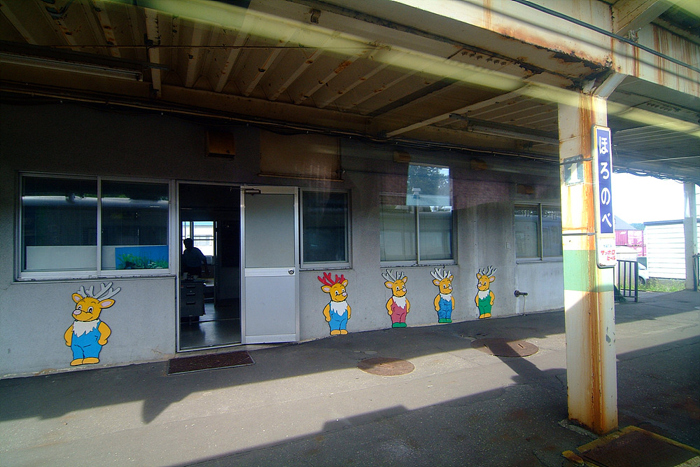 <사진 908> 호로노베 역입니다. 역 근처에 토나카이 목장이 있어서, 저렇게 사슴 그림으로 장식을 하였습니다.'