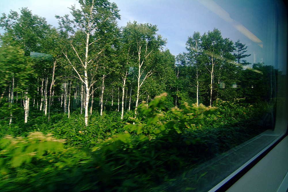 <사진 909> 이 부근의 원시림지대가 바로 제가 타고 있는 열차, "사로베츠"란 명칭의 유래가 된 사로베츠 원야입니다. 무성한 자작나무숲이 보이는군요. 어딘가 신령스러워 보이기도 하고, 깨끗한 흰색이라 제가 참 좋아하는 나무입니다.