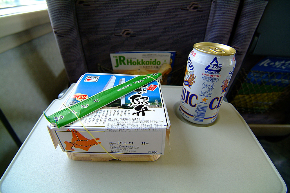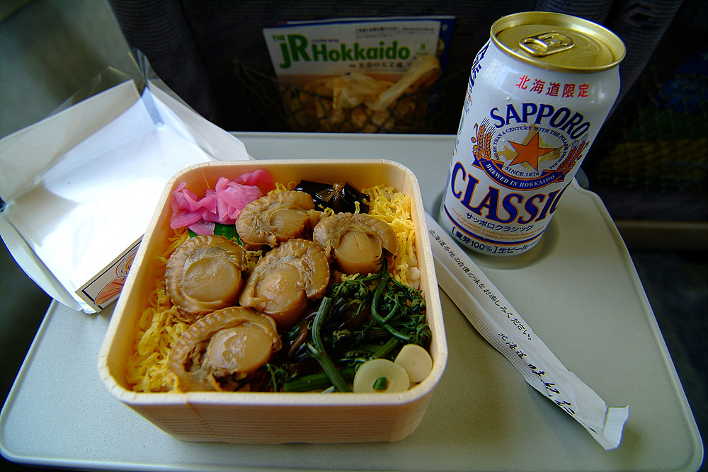 <사진 900,901> 점심시간이라 왓카나이역에서 사온 에키벤을 먹습니다. "최북에키벤(호타테)"입니다. 간장에 조린 가리비를 주 재료로, 밥과 계란, 야채가 함께 들어있습니다. 가리비가 큼직한 것이 쫄깃하고 향긋해서 매우 맛있더군요. 입가심으로 맥주도 한잔~