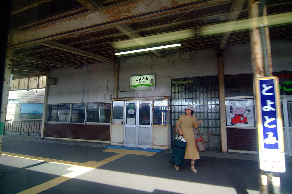 <사진 907> 도요토미 역입니다. 낙농업이 발달한 곳 답게, 젖소 그림이 있습니다.