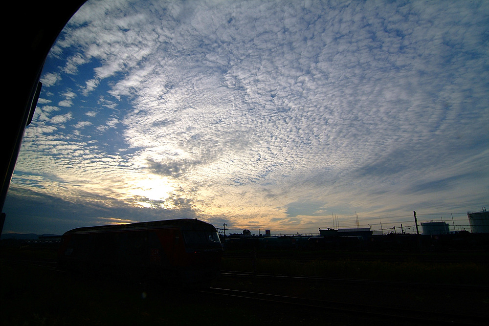 <사진 923> 차츰 석양이 지고 있습니다. 여기는 아사히카와역 직전, 이제 세키호쿠본선, 후라노선이 다 합류하였습니다. 사진에 보시면, 바로 앞에 흔치 않은 DF200형 JR화물 디젤기관차가 있는데, 역광이라 잘 안보이는군요.