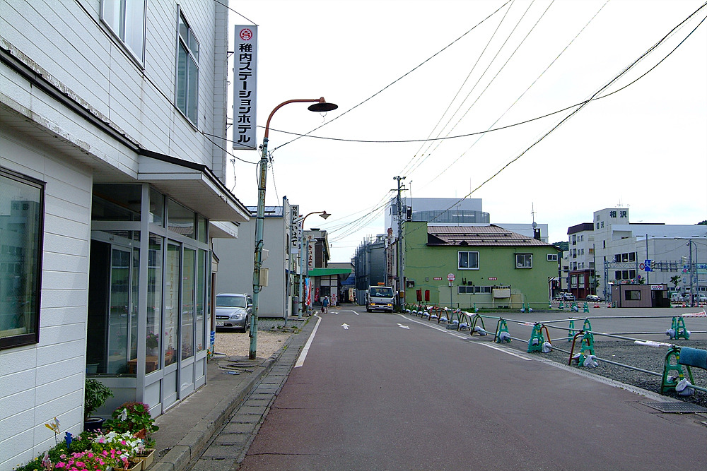 <사진 897> 왓카나이역 가는 길입니다. 조 앞에 길이 끝나는 곳이 왓카나이역입니다. 그건 그렇고, "**스테이션 호텔"이라는 거창한 이름 치고는 상당히 규모가 작군요^^