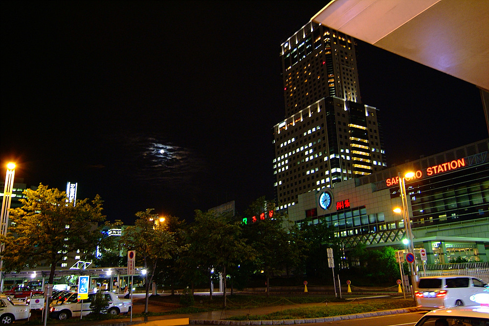 <사진 933> 삿포로역의 전경입니다. 구름 사이로 달이 빛나는군요. 이제 숙소를 찾아야 합니다. 전에도 말씀드렸듯, 이번 여행은 전혀 예약을 안 하고 갔기 때문에 잘못하면 숙소잡느라 큰 고생을 하게 됩니다. 이날도 좀 힘들었습니다. 토요코인도 다 만실이고 해서...