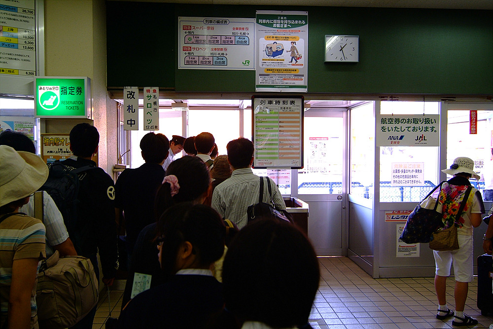 <사진 898> 왓카나이역은 열차대수가 적어서 그런가, 일반적인 경우와 다르게 열차가 홈에 입선한 이후에야 개찰을 시작합니다. 특급 사로베츠 자유석 승객들이 길게 줄을 서 있다가, 개찰이 시작되어 들어가고 있습니다. 저도 함께 들어갑니다(지정석이 매진되어 할 수 없이...).