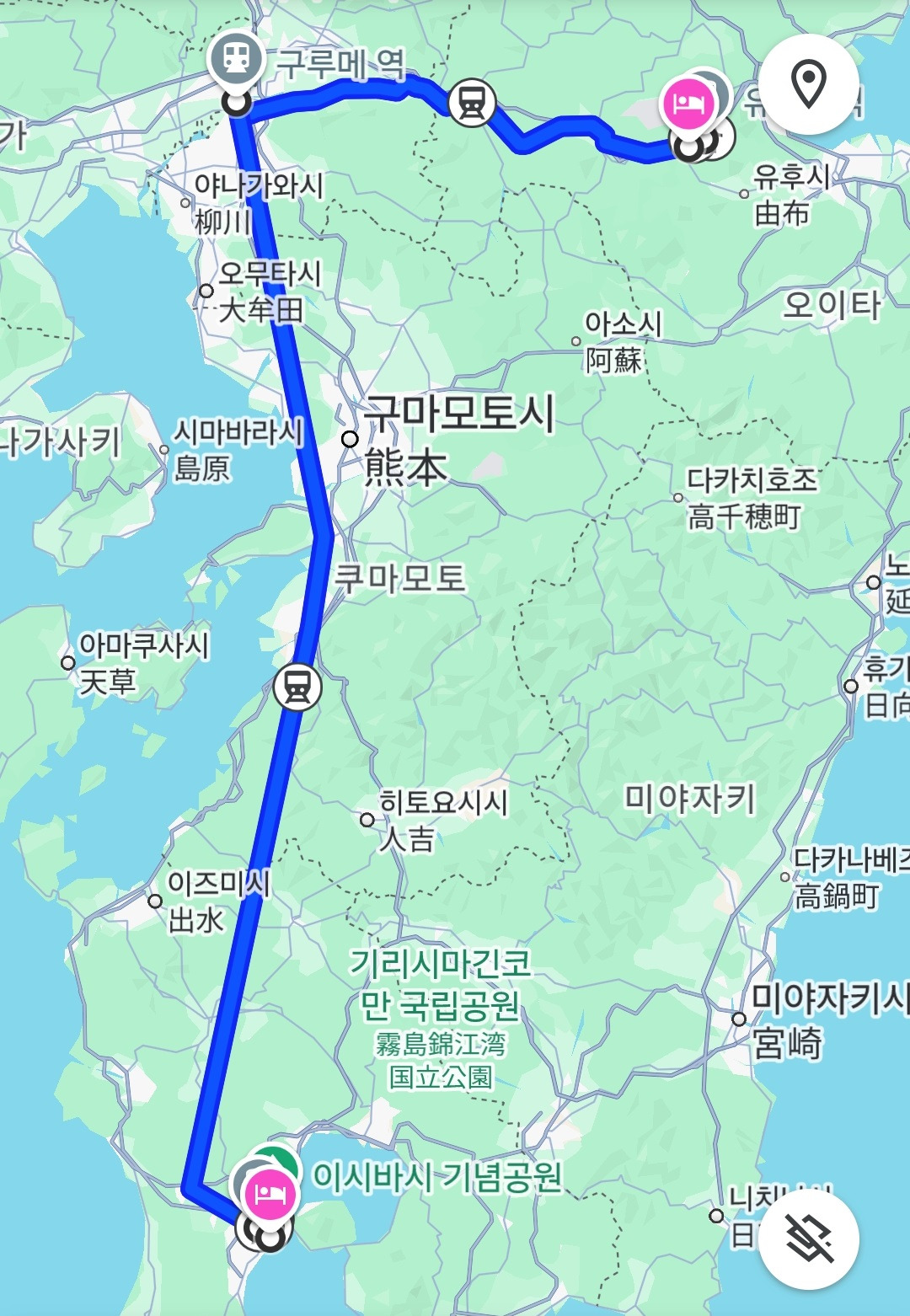 지도에서 보듯이 3일째는 큐슈 남부 가고시마로 이동합니다. 14년전 여행은 북큐슈 여행이라 남쪽은 가보지 못했는데 이번에는 남쪽으로 이동해봅니다. 14년전과는 달리 이제 큐슈 신칸센이 완전 개통이 되었기때문에 큐슈 신칸센을 탑승해 볼 수 있었습니다.