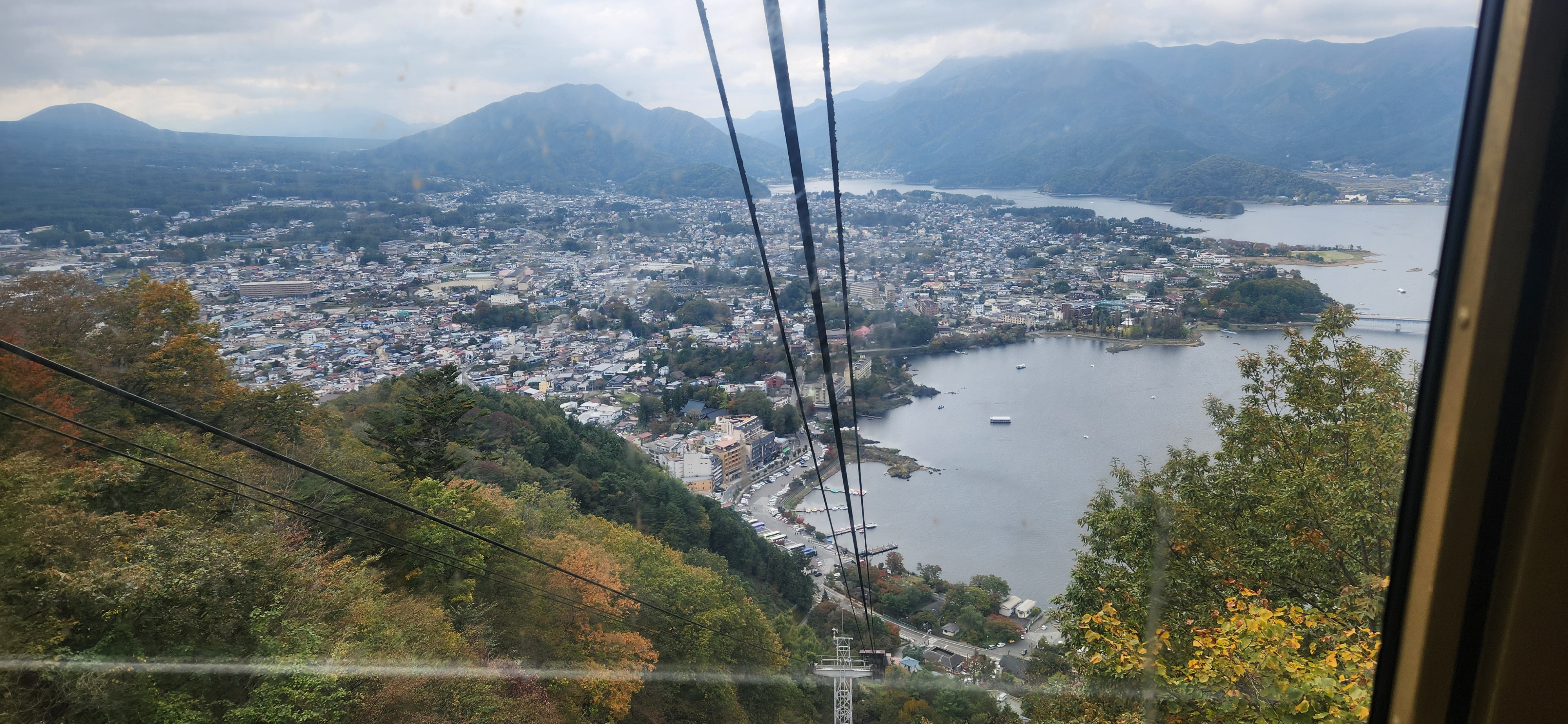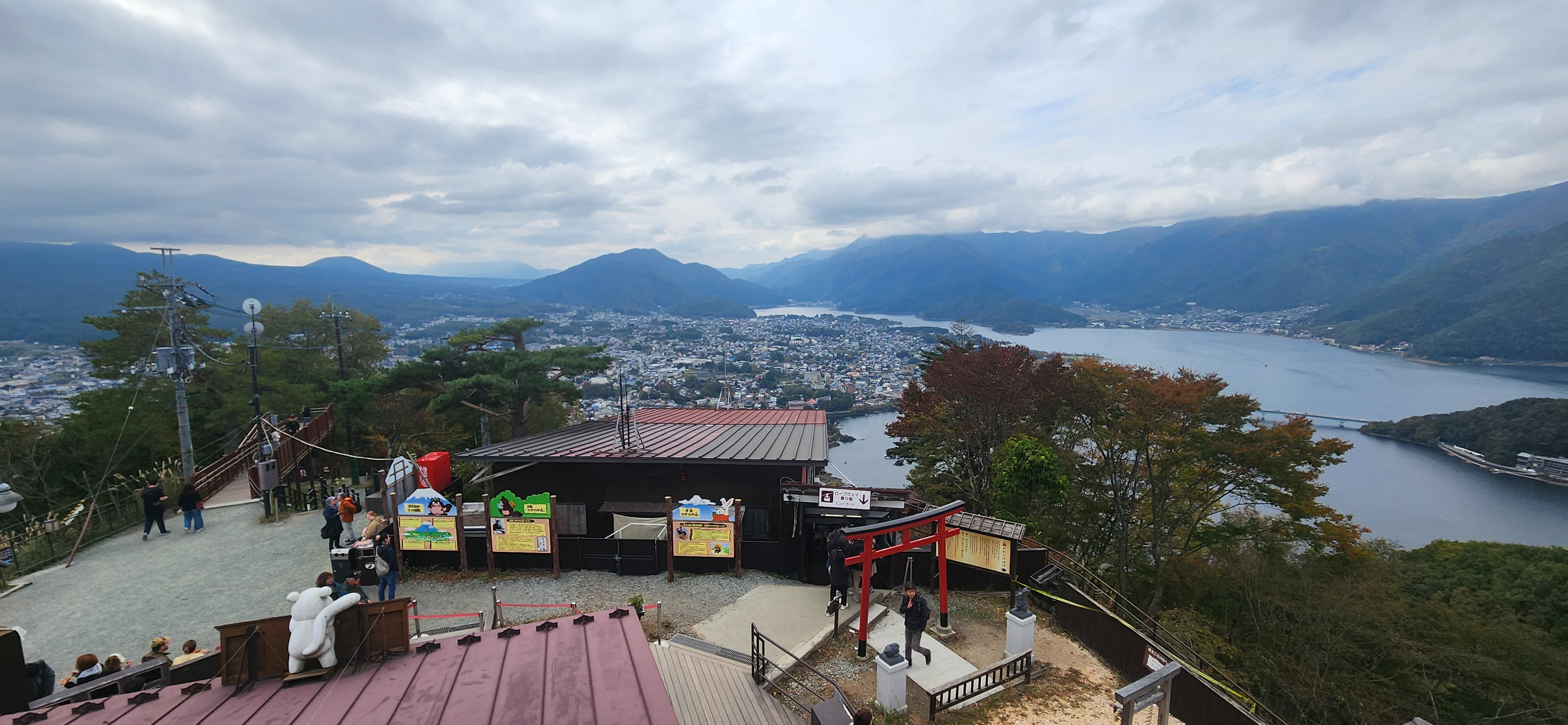 로프레이를 타고 산 정상으로 올라왔습니다. 한 눈에 보이는 가와구치호수가 정말 멋지네요.