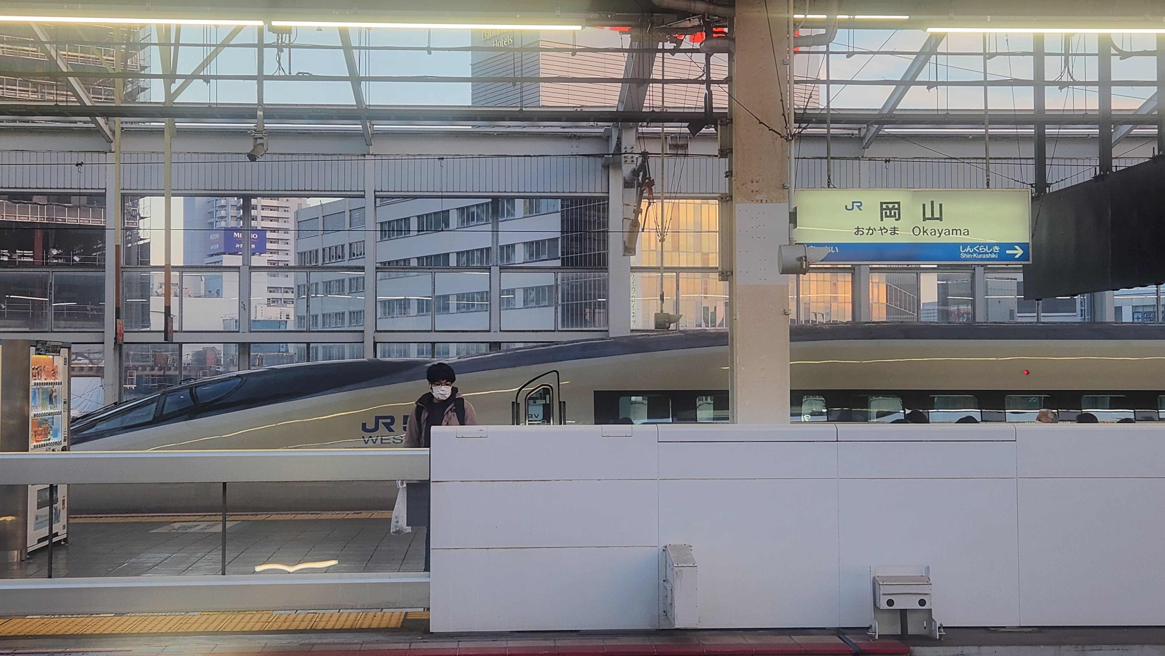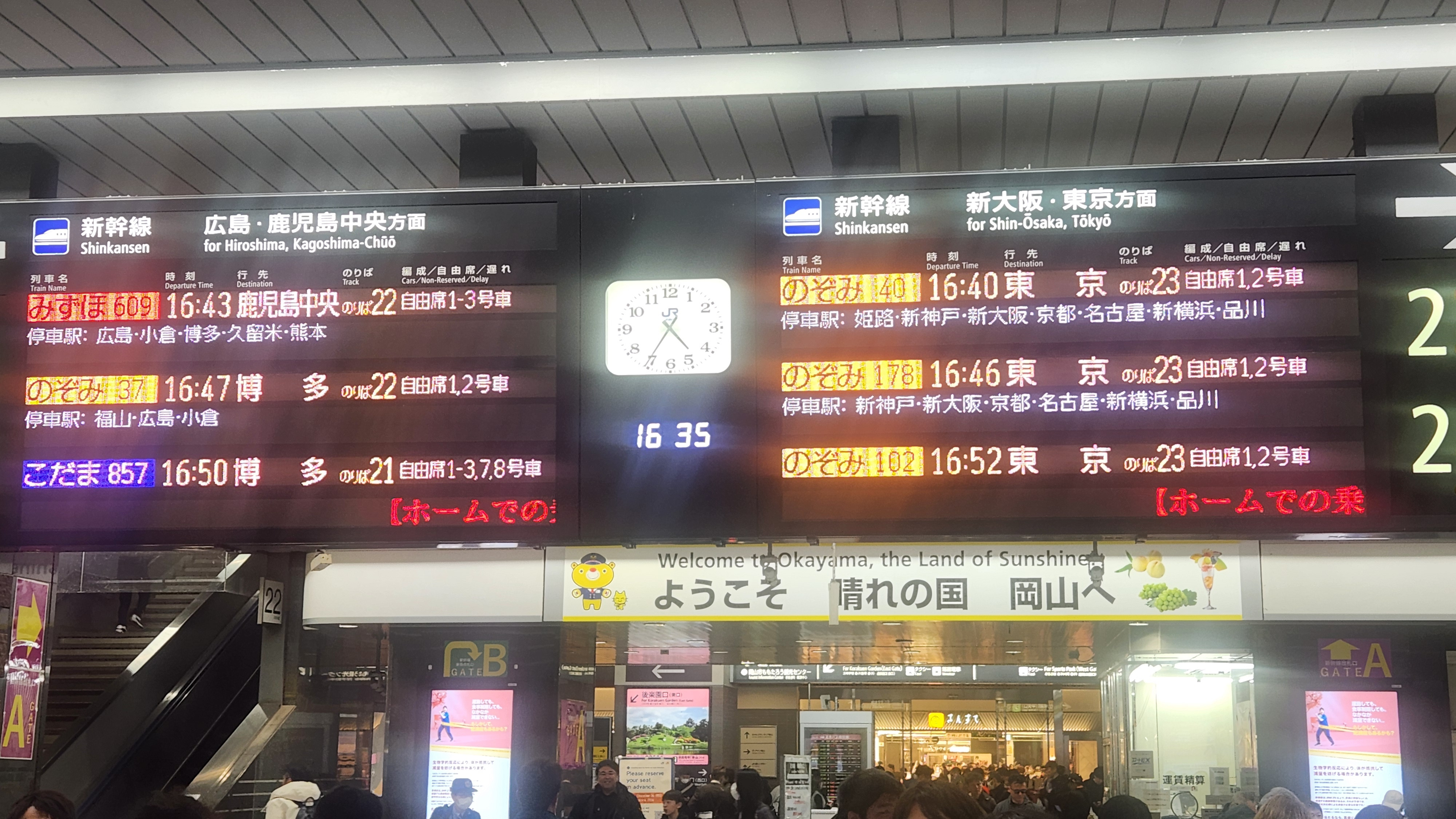 오카야마역에 도착하여 신칸센을 이용하기 위해 신칸센 플랫폼으로 바로 이동합니다.