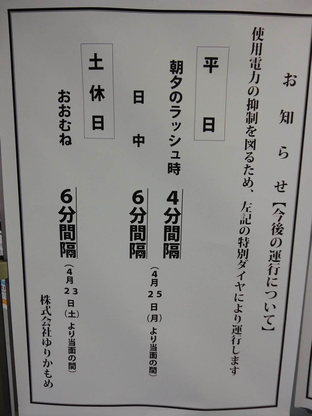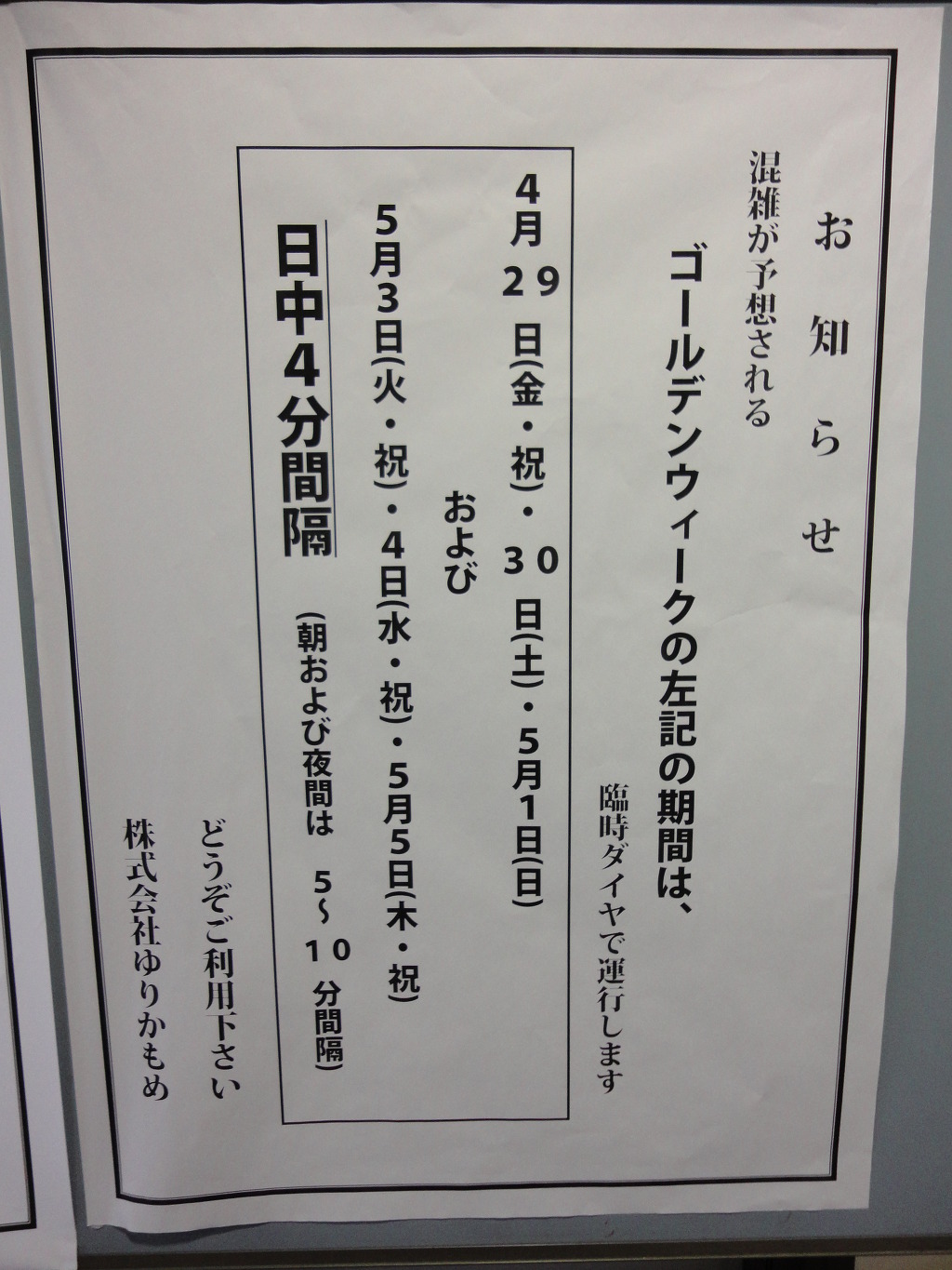 아래 사진은 유리카모메 역에 설치된 안내문입니다. GW기간에 다이야를 좀 더 단축해서 운행한다는 것을 알 수 있습니다.