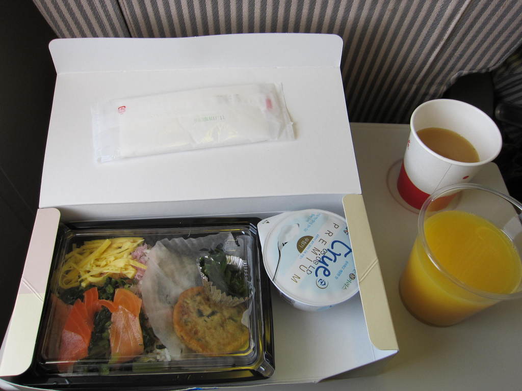 (드디어 기다리고 기다리던 기내식이 나왔습니다. 저는 항상 미소 시루와 오렌지 쥬스를 먼저 시키고, 나중에 레몬 쥬스와 녹차, 커피를 또 주문합니다. 비용 절감을 위해 점심 역할도 해야 하므로 배를 가득 채우는 것이 중요합니다.)