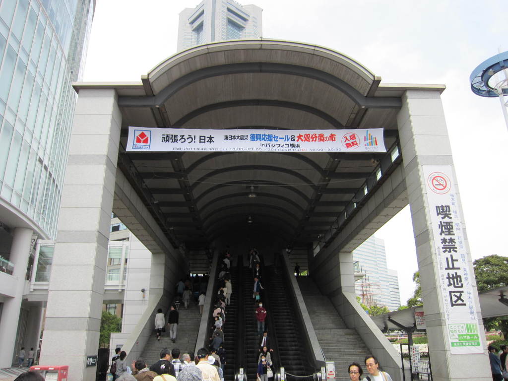 (퍼시피코 요코하마 회의장까지 가려면 빠른 걸음으로 많이 걸어야 합니다. 에스컬레이터를 타려는 순간 동일본 대지진이 실감나는 현수막이 크게 보입니다. 에스컬레이터 중 한개는 절전을 위해 폐쇄한 것도 대지진 이후의 정세를 보여줍니다.)