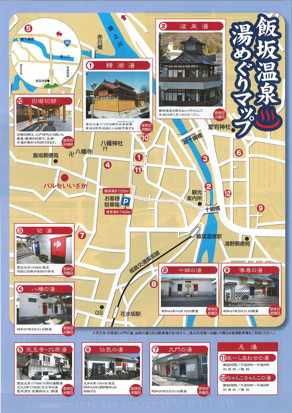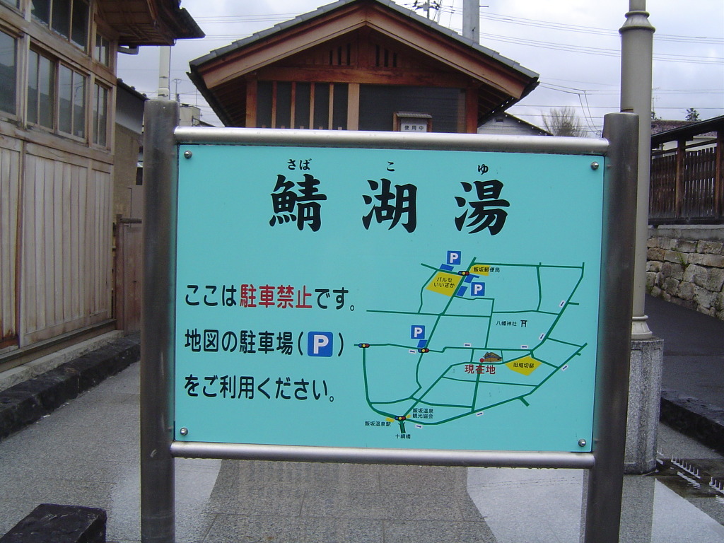 [(사진-19) 온천 안내 표지판입니다. 사바코유는 메이지(明治) 22년, 즉 (1889년에 건축된 유명한 고탕(古湯)입니다. 이 지역에서는 최근까지 당일치기 온천 8개를 순회하는 '8탕 메구리'가 유명한데 단연 중심일 뿐만 아니라 이이자카 온천의 상징입니다. 너무나도 복고풍이라서 기대가 큽니다.]