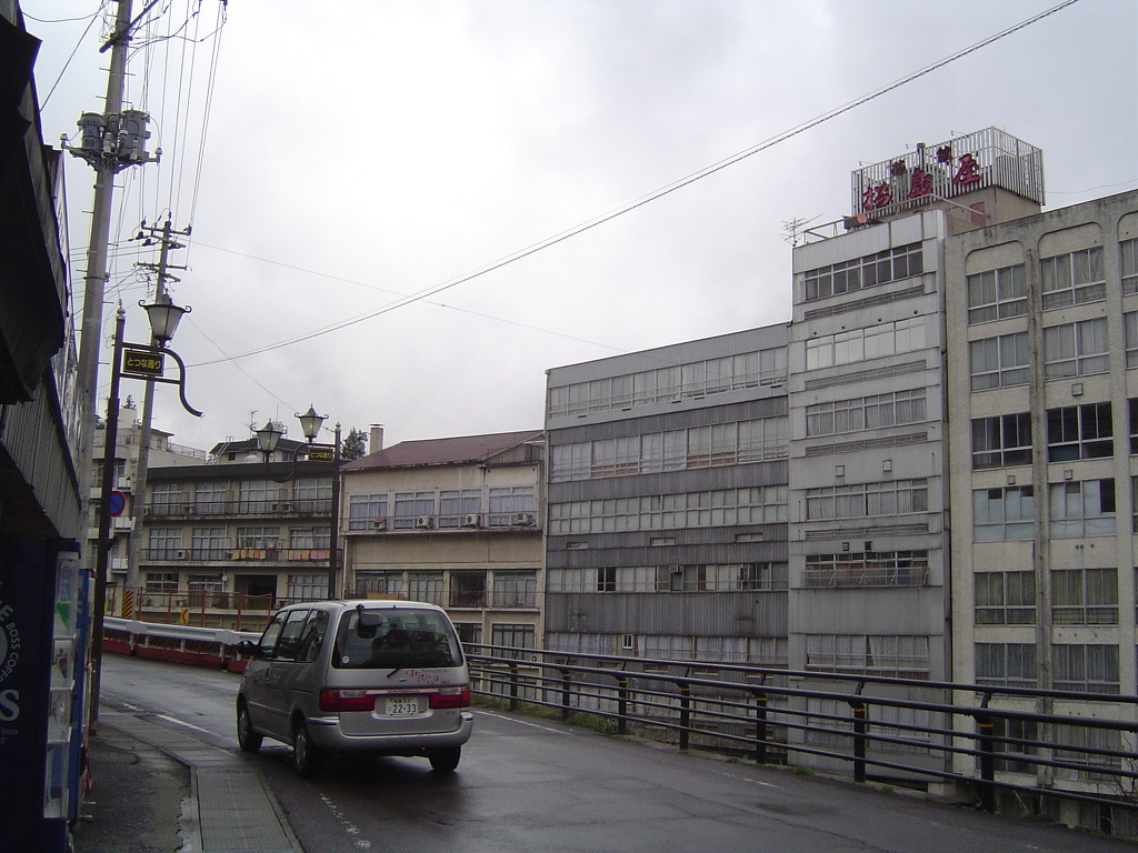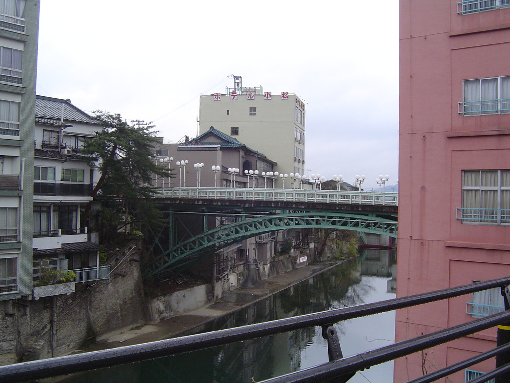 [(사진-10) 역사 밖으로 나와서 두리번 거리니 눈에 들어오는 것은 전형적인 오래된 일본 온천향의 여관 건물들입니다. 강을 끼고 호텔형 여관들이 형성되어 있습니다]