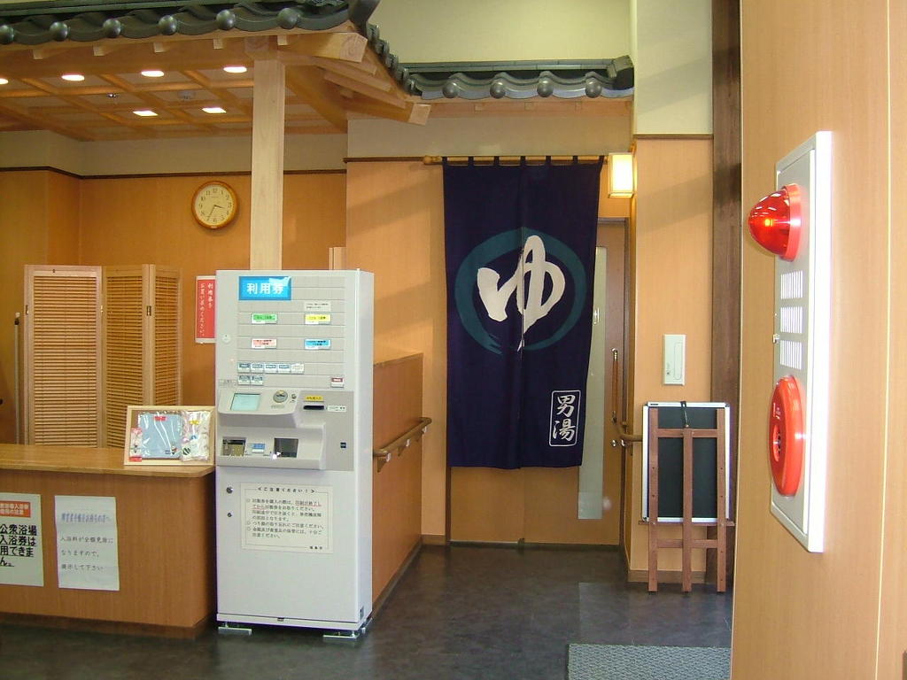 [(사진-21) 드디어 입구로 들어갑니다. 문을 열자마자 200엔의 요금을 받는 노인분이 계시고, 고개를 주욱 내미니 바로 탕입니다. 규모는 동네 목욕탕 수준입니다. 허걱 - 아침부터 노인 분들이 10여분 있었습니다. 사진 촬영을 할 수 없군요. 게다가 개인 라커도 없네요. 그러나 안심하고 카메라 가방과 현금/여권이 있는 가방을 바구니에 놓으라고 합니다]