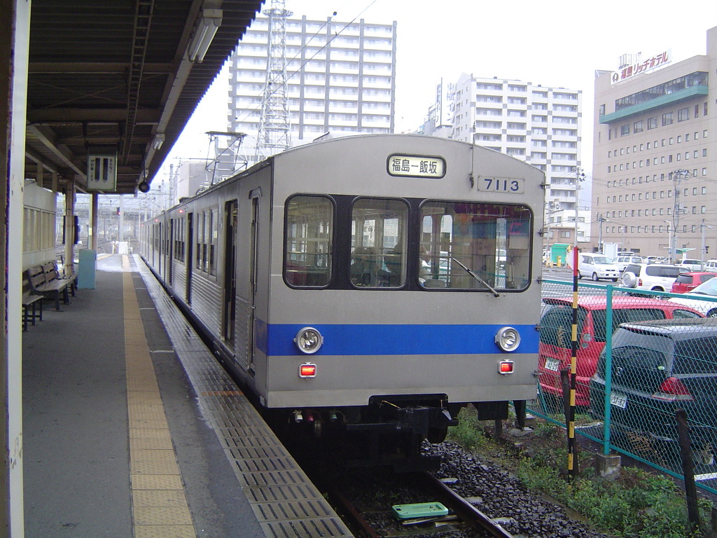 [(사진-06) 보통열차가 대기하고 있습니다. 4월 날씨가 궂은 평일 아침 8시가 안되었는지 인적이 드물었습니다. 이 차량은 후쿠시마시 교통국(福島交通) 소속의 이이자카선(飯坂線)의 전동차입니다]