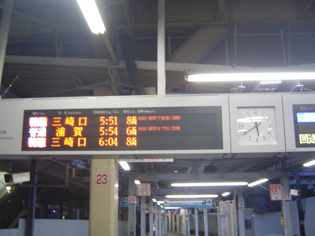 [(사진-11) 새벽 5시 20분입니다. 그리고 첫 차는 시나가와행으로서 (05 : 26)분에 들어 옵니다. 제 첫 임무를 완수하기 위해서는 이 첫 차량을 타고 가마타역에서 1분 차이로 요코하마행 보통 열차로 환승을 하는 것입니다. 이는 무리한 스케줄은 아니며 현지 일본인들은 가마타역에서 그런 식으로 자주 환승을 하는 듯 했습니다]