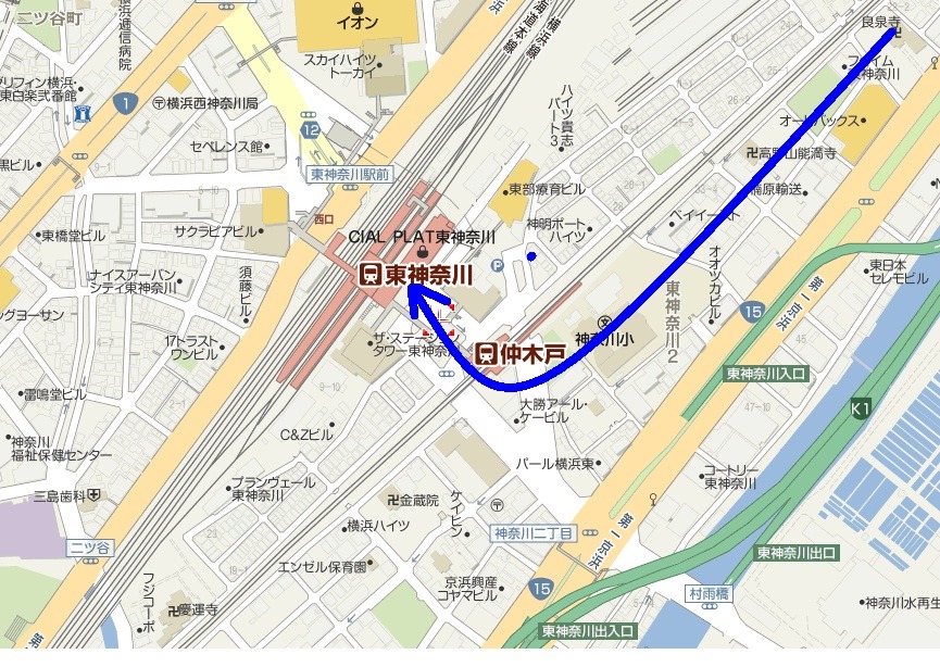 [(사진-16-1) 저의 첫 작전을 다시 점검해 봅니다. 케이큐 나카키도역에서 하차한 후에 JR히가시 가나가와역으로 가는 것입니다. 나카키도역에는 보통전차들이 정차하므로 제가 이렇게 첫 차를 타고, 가마타역에서 재빨리 환승해야 탈 수 있습니다. 아울러 이 두 역들이 지도에서 보면 130m 밖에 떨어져 있지 않으므로, 어떤 역 풍경들이 있을지 사뭇 궁금해서 첫 작전지로 삼았습니다. 게다가 히가시 가나가와역은 JR 패스를 발급하는 신요코하마역으로 가는 요코하마선 출발지이므로 매우 잘 맞아 떨어지는 작전인 것 같아서 스스로 흡족했습니다. 또한 새벽부터 작전을 하니 올빼미 여행 취지에도 부합되는 것 같았습니다]