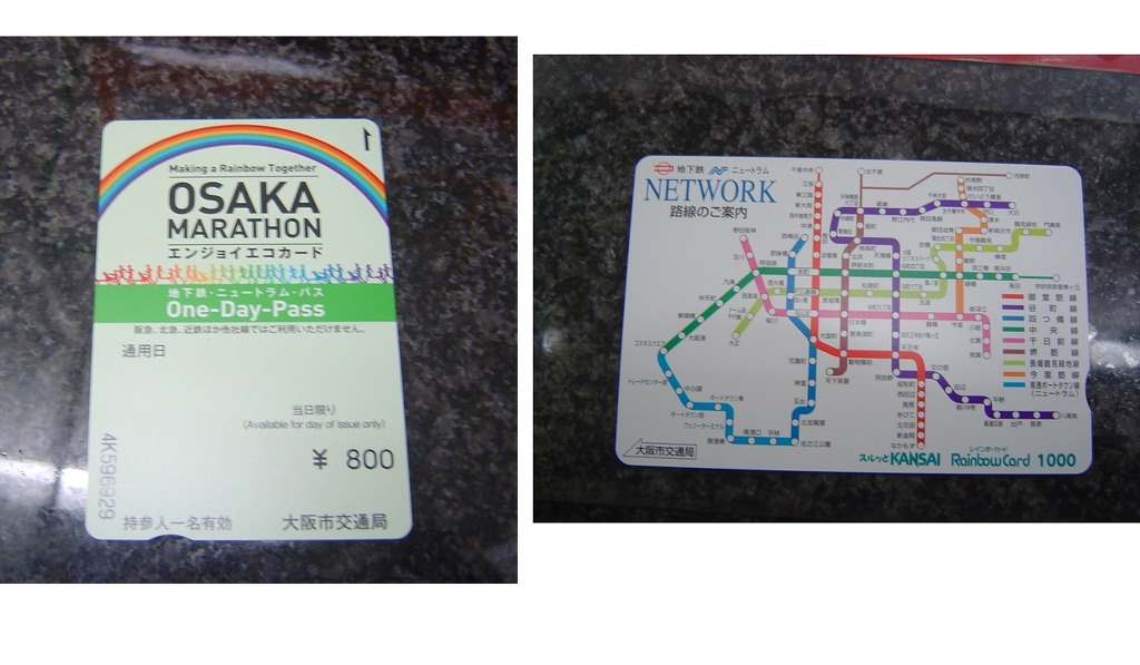 [(사진-17) 처음에는 800엔을 주고 왼쪽의 지하철-버스 1일 승차권을 구입합니다. 그런데 눈에 띄는 처음보는 오른쪽 카드가 눈에 들어 왔습니다. 오잉?-쓰루토 간사이 레인보우 카드 1000엔권입니다. 판매원에게 이 카드의 용도에 대해 물어보고, 답변을 들으니 노선도에 있는 다양한 철도회사의 노선 구간들을 자유롭게 이용할 수 있다는 뜻으로 저는 이해를 하였습니다. 우와-저는 간사이 쓰루 패스 1일권이 신규 출시된 것으로 착각을 하였습니다]
