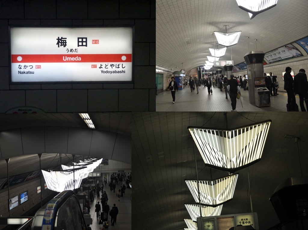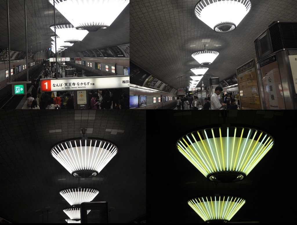 [(사진-20) 신사이바시역 미도스지선에서 지하철을 타고 북쪽 센리 츄오역까지 가야합니다. 레인보우 카드의 첫 사용입니다. 승강장으로 급하게 가는데, 우와-역 구내 천장을 보니 형광등들이 보통 같지 않고 예술적인 것이 예사롭지 않습니다. 형광들들을 이리저리 촬영해 보았습니다]