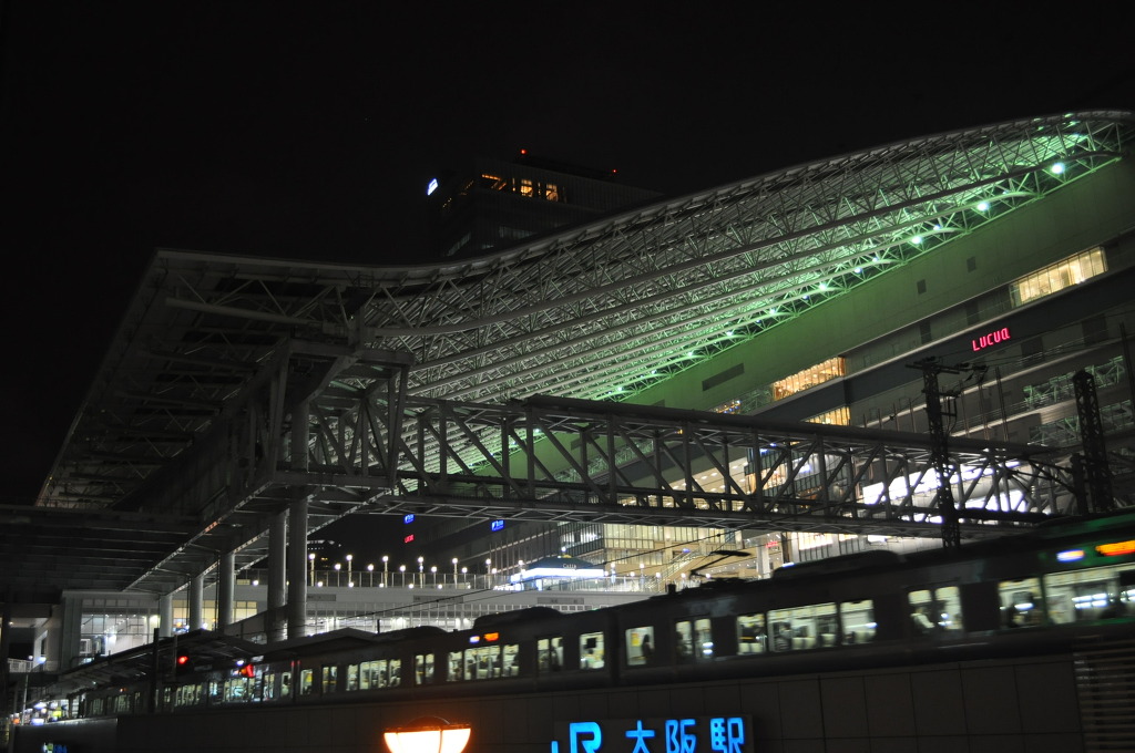 [(사진-46) 이제 더 이상 어떤 탐사도 하지 못할 정도로 피곤합니다. 숙소인 라이잔 호텔로 가야 합니다. 신오사카역의 코인라커에 짐을 넣어두었으므로 신오사카역까지 가야 합니다. 그 도중에 잠시 8개월 전에 새로 리뉴얼 개장한 JR오사카역 구경을 하러 갑니다. 탐사 의욕은 없고, 오로지 야경을 감상할 목적입니다. 그런데, 거대한 오사카역을 보고 황홀해하며, 그 야경에 입이 딱 벌어집니다.]