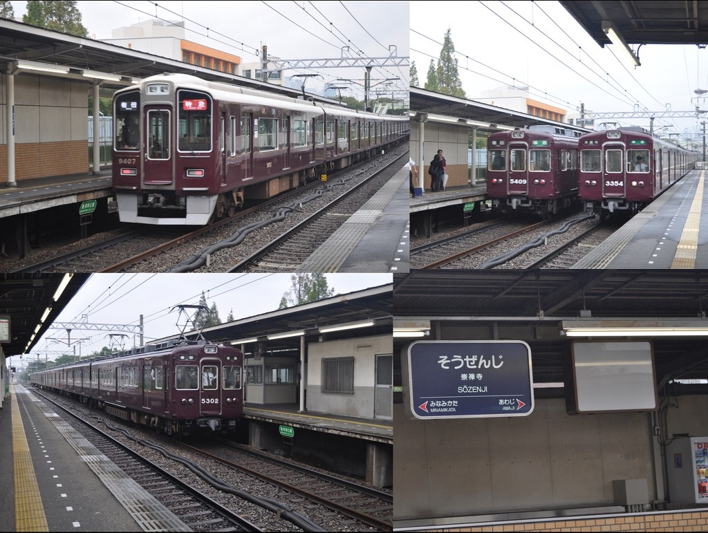 [(사진-34) 도중에 소젠지역에 하차하여 잠시나마 다양한 한큐 차량들을 촬영합니다. 허걱-모두 밋밋하게 단순 고동색 일색이군요.]