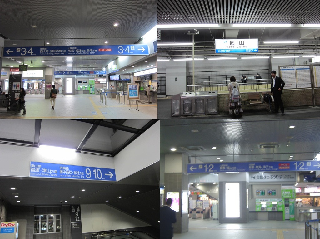 [(사진-06) 허걱-오카야마 재래선 역사에는 무려 10번 홈까지 있습니다. 한쪽 홈에 열차가 들어와서 그 쪽으로 가면 다른 홈으로 또 열차들이 들락 거립니다. 아픈 무릎때문에 에스컬레이터에서 가만히 서서 느리게 오르락 내리락 하지만, 이 홈, 저 홈을 왔다갔다 하니 정신이 없습니다.]