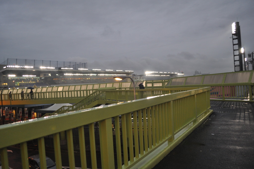 [(사진-42) 스미노에코엔역을 나오자 마이크 소리가 웅웅 울리며 요란합니다. 육교 보도로 걸어가자 현란한 불빛의 경정장이 있는 곳입니다. 육교에 벽이 높아서 경정장은 볼 수 없군요. 어둑한 하늘을 보니 벌써 오후 5시가 훌쩍 넘었습니다. 이젠 다리도 뻐근하고 그야말로 파킨슨 환자가 따로 없네요. 제가 발을 질질 끌며 가고 있습니다]