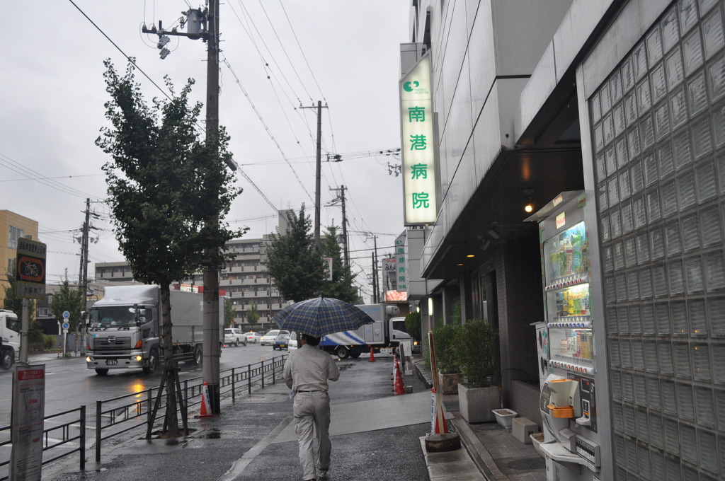 [(사진-18) 비가 어느정도 누그러지고, 보슬비로 바뀌었습니다. 신사이바시역 근처에 있는 출장지에서 저를 픽업하기 위해 나온지라 지하철 이용을 하지 않고 자가용차로 신사이바시로 가서 업무를 간단히 봅니다]